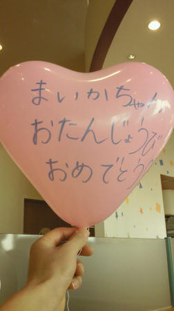そこでバースデーセットを注文。記念写真を撮って、ハッピーバースデー歌って、バースデーケーキもらって、ついでに風船まで。しかもこれで500円。安っ!苺ちゃんも大喜び♪