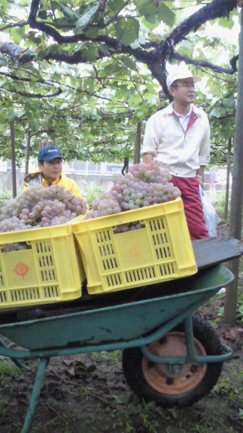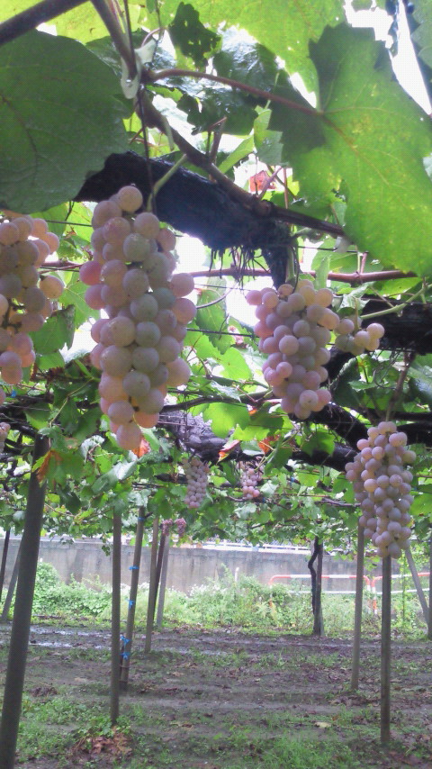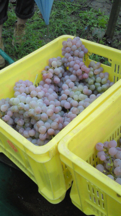 畑に行って、国産白ワインの主流品種の「甲州」の収穫をしました。甲州はグリーンの皮の白い葡萄かと思ってたら、うっすら赤い葡萄なんですね・・・。そしてカベルネやメルローのように垣根栽培かと思いきや、食用の葡萄と同じような棚栽培でした。これにもスゴイ驚きました!
