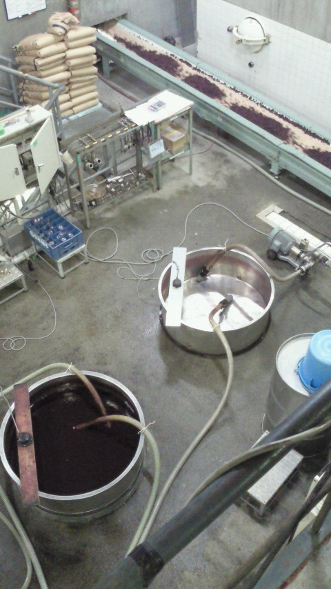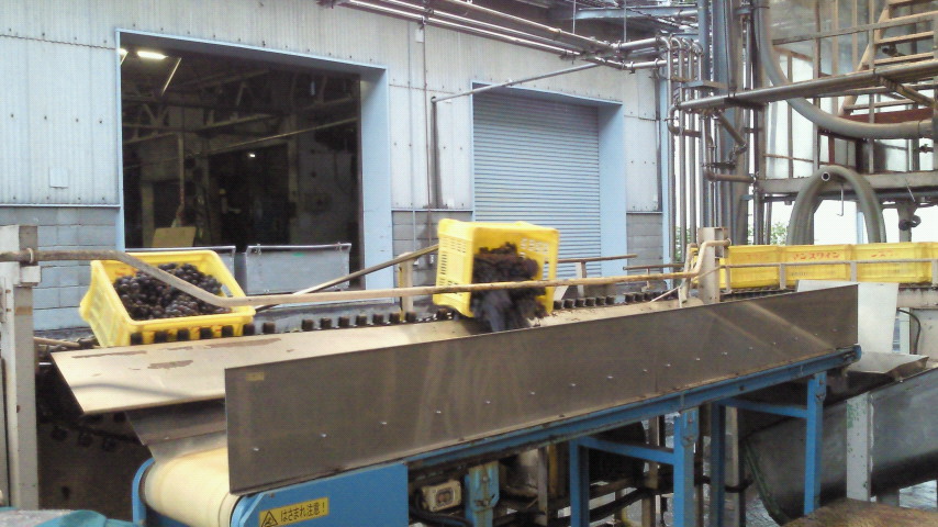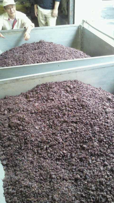 ベルトコンベアーで流れてるのは絞り取られた葡萄の皮。